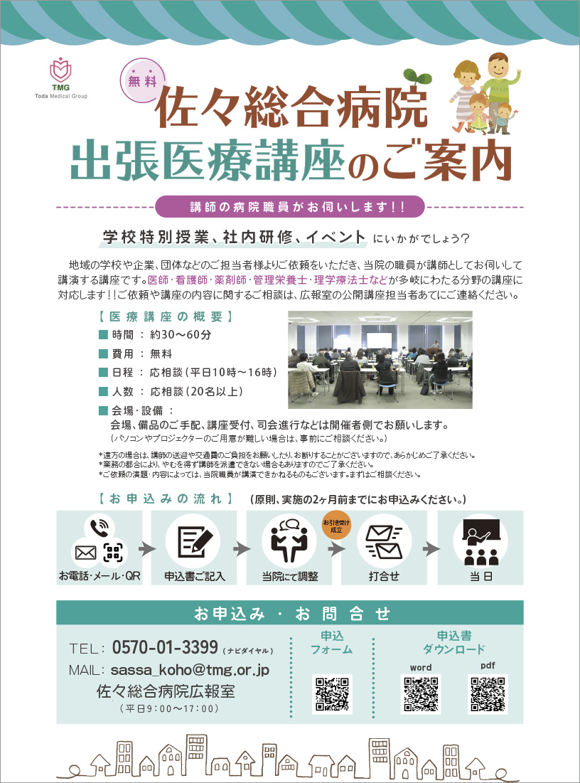 地域の学校や企業、団体などのご担当者様よりご依頼をいただき、当院から病院職員が講師としてお伺いして講演する講座です。医師・看護師・薬剤師・管理栄養士・理学療法士などが多岐にわたる分野の講座に対応します!!地域の社会福祉活動、企業様の職員研修、学校の保健教育などにどうぞご活用ください。